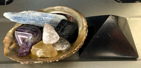 For example, the crystals on my desk are ones that help with concentration and focus. Kyanite, Amethyst, Fluorite, Rose Quartz, and Black Tourmaline are in the small shell. I also added a Shungite pyramid that may help with protecting me from the EMF’s created from the computer and screen.