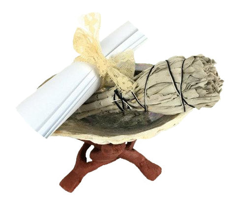 Smudge Kit for Beginners – 4 Pieces – Perfect for bringing in positive energy and banishing the negative – Abalone Shell, 4″ White California Sage Stick, Wooden Stand, & Instructions
